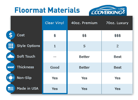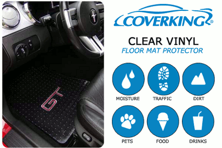Keep your carpets or your floor mats clean while letting their original color and logos to show through. Coverking Vinyl Floor Mats are cut from clear vinyl, so they don’t compromise your interior colors. Nibbed backing grips your carpet to keep the mats firmly in place. You can use Coverking Clear Vinyl Floor Mats over your factory mats or in place of them to keep your carpets clean and safe from spills, mud, and heavy heels. Top-notch construction goes into every piece. Coverking Vinyl Floor Mats don’t just look great – they’re tough carpet defenders, too. Every Coverking Vinyl Floor Mat is made with pride in Coverking’s California plant here in the USA.